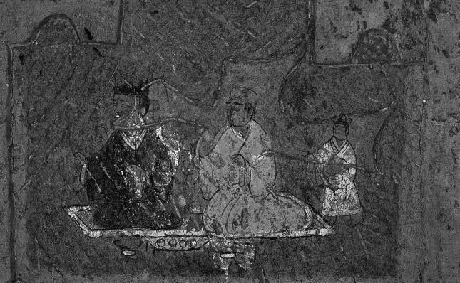 宴饮图第三幅,左边两人坐于席上,面前置案,案两边摆有盘