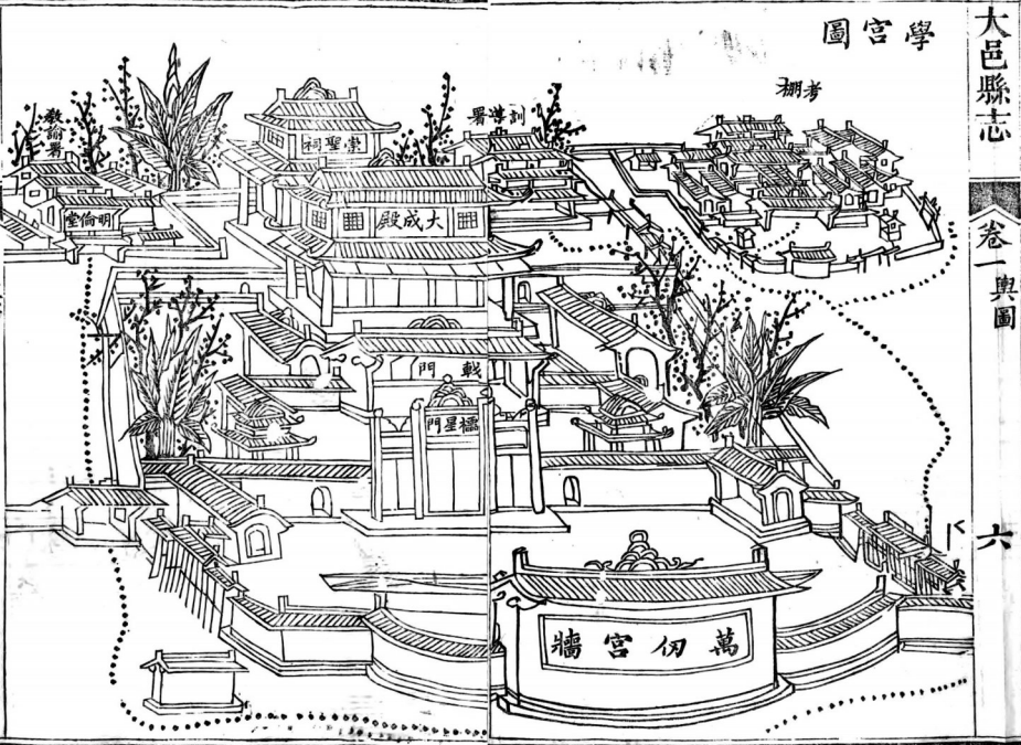 大邑县文庙位于城南,始建于明洪武初年。按定制,县文庙坐北向南,中轴线上依次为万仞宫墙、泮池、棂星门、戟门、大成殿、崇圣祠。中轴线两侧按“左尊右卑”的次序建了乡贤祠、名宦祠、忠义祠、节孝祠,供奉着贤达、名臣、义士、烈女等值得褒奖的人。