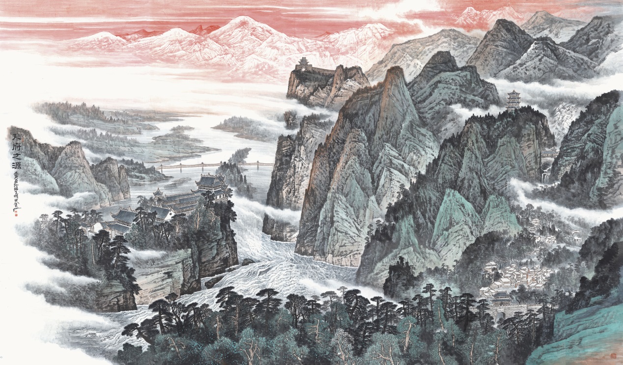 《天府之源》是以都江堰景观为题材的山水画,高3.8米、宽6.4米,画面以青黛色为主调,被朝霞映红的磅礴雪山,蜿蜒而下的岷江之水,由远及近、递次呈现,最终隐入一片葱茏树木之间。作品中刀劈斧凿般的玉垒山迎江矗立,江水绕山而过,凸显都江堰之水的清澈灵动。